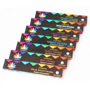 Пахощі Chakra Collection – унікальна суміш рідкісних трав, квітів, меду, смол, чистого порошку сандалового дерева, ароматичних коренів та натуральних ефірних олій, що не містять токсичних речовин, підібраних на основі стародавніх священних книг. Кожна упаковка має спеціальну суміш трав та спецій для лікування та допомоги певній чакрі, розслаблення та усунення негативної енергії. Відмінно підходять для йога-практики, сеансів ароматерапії, медитації чи просто для гарного відпочинку. Ароматичні палички 7 Chakra скручуються вручну в Індії відповідно до давніх традицій з чистих і натуральних інгредієнтів.