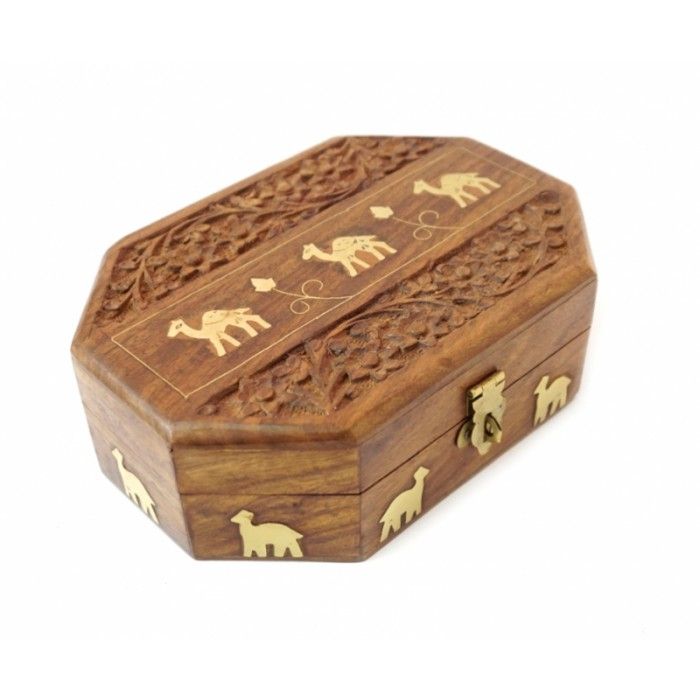 Скринька з червоного дерева восьмигранна з латунною інкрустацією Верблюди