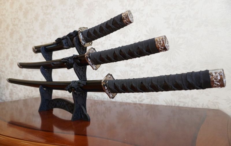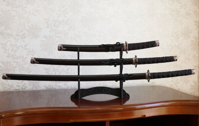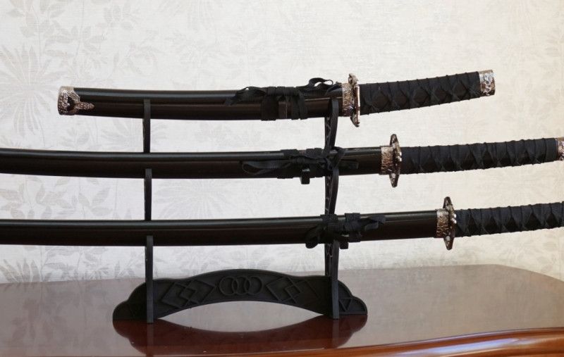 Набір з трьох самурайських мечів на підставці L = 100см. 78см. 54см