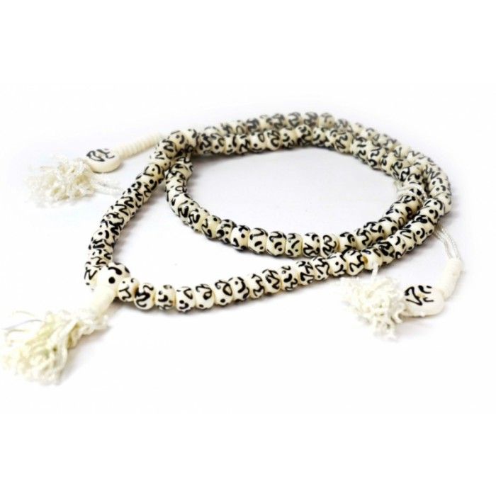 Чотки з кістки ОМ санскрит чорні + білий малюнок 8 мм 108 намистин.